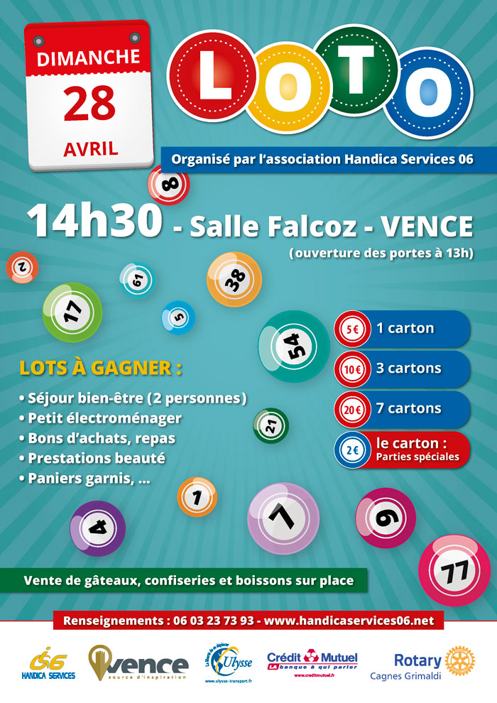 Dimanche 28 avril, l'Association HANDICA SERVICES 06, va organiser son 1er grand loto à la salle Falcoz de Vence.