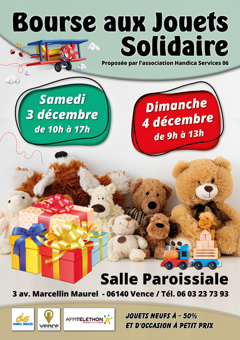 Pour découvrir notre bourse aux jouets solidaire, nous vous donnons rendez-vous les 3 & 4 décembre à la Cité Paroissiale de Vence.